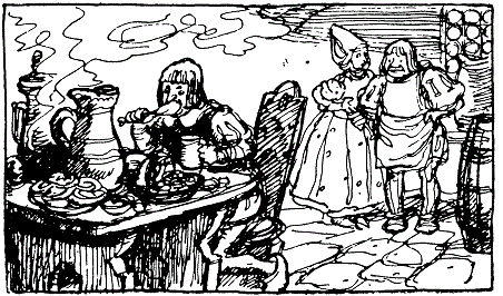 «Voilà le moment d’essayer cette table!» Il pose la table sur l’herbe et dit: «Table, table, entable-toi!» Alors la table se couvre de tout un dîner. Le pauvre homme ne croit pas ses yeux. Mais il mange avec grand appétit et boit du vin, car sur la table il y avait aussi des bouteilles de vin. Puis il met la table sur son épaule et repart. Il pense à la joie de sa femme et de ses petits enfants. La nuit vient. Il voit une maison — c’était une auberge. Il entre. — Ne me logerez-vous pas, moi et ma table? — Il y a beaucoup de place pour vous et votre table, dit la servante qui se trouvait près de la porte. Entrez et asseyez-vous! — Je ne veux pas manger. J’ai fait un souper comme jamais de ma vie. Je veux un lit pour dormir. — On vous donnera un bon lit dans une bonne chambre, et votre table restera ici, en bas. — Bon, dit l’homme de la Misère, mais ne dites pas à la table: «Table, table, entable-toi!» Il monte dans sa chambre, il se couche. Cependant la servante s'approche de son maître et lui raconte tout. L’aubergiste dit: «Table, table, entable-toi!» Et la table se couvre de plats. Tous les deux ouvrent de grands yeux. Quel bonheur d’avoir cette table dans notre auberge! N’avoir plus besoin d’acheter les viandes, de préparer les sauces! Vite, vite ils changent la table. Le lendemain, l’homme de la Misère descend très content. — Eh bien! brave homme, comment avez-vous passé la nuit? lui demande l’aubergiste. Merci, très bien. Où est ma table? — La voilà. — Au revoir! Il prend la table et se met en route (1). |