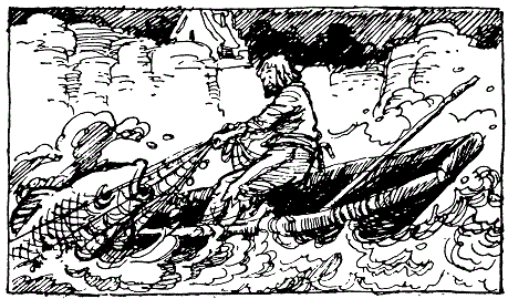 pour les petits. Le lendemain il se lève avant que le coq chante. Il va à la rivière dans le brouillard, il jette son filet, le tire, et voilà qu’il amène un poisson si gros, si gros qu’il ne pouvait pas le mettre dans la barque. — Pauvre poisson, ce n’est pas moi qui t’ai donné la vie, ce ne sera pas moi qui te donnerais la mort! Et il remet le poisson à l’eau. Il remonte la rivière (2) un peu plus loin; à un autre endroit il rejette le filet dans la rivière. Mais quand il le ramène, il ramène de nouveau un gros poisson. Cette fois il le met dans sa barque. — Pauvre poisson, tu es trop grand pour moi ! Il retourne à la cabane et appelle sa femme. — Ha! pauvre femme! Regarde ce que je t’apporte. Le poisson était si gros qu’il n’y avait pas de poêle où le faire cuire (3). Ils allument un grand feu, ils mettent le poisson sur lès pierres plates et préparent le dîner. Enfin ils mangent le poisson. Cependant le poisson était si gros, si gros, que le père, la mère et les enfants ne pouvaient le finir. Ils appelèrent le petit chien et lui donnèrent les restes. Le chien mangea le poisson et devint rond comme un tonneau, mais il ne pouvait pas aussi le finir. Alors la mère porta ce qui restait au cheval. Le cheval mangea le poisson, mais il restait encore un gros morceau. — Eh bien, dit le père, je vais enterrer ce qui reste dans le jardin, sous notre arbre! Il prit sa bêche et fit un grand trou sous un grand arbre, au fond du jardin et mit là ce qui restait du gros poisson. Le lendemain le chien avait trois petits chiens, le cheval trois petits poulains. — Il faut aller voir dans le jardin, dit le père. |