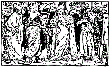 il partit, parce qu’il savait que bientôt il serait en danger. La fille du roi prit ces pommes, les mangea l’une après l’autre, et le nez se mit à pousser; jusqu’à l’estomac, jusqu’aux genoux; pour finir jusqu’à ses pantoufles. Elle chercha le magicien, qui ne se trouva plus. Elle appela les médecins, mais pas de remède (1). Le troisième jour on vint dire qu’un sorcier était là qui voulait lui parler. Entre un homme, tout noir. Il tire une pomme plus jaune que l’or et dit que la demoiselle n’aura plus ce nez long si elle la mange. La demoiselle se décida à la manger. Et, oh bonheur! son nez diminua un peu. Mais le nez ne reprit pas sa vraie forme. Alors le sorcier dit: — Peut-être la demoiselle a un trésor qui ne lui appartient pas? Elle tira la bourse magique de sa poche et la donna au sorcier. Il prit la bourse et la cacha. La deuxième pomme jaune eut son effet: le nez diminua un peu plus. — Probablement il y a encore une chose qui n’appartient pas à la demoiselle? — Presque rien, seulement ce cornet de cuivre que j’ai gardé. Elle donna le cornet, reçut une troisième pomme, la mangea, et son nez diminua de nouveau un peu. Mais le nez était encore assez long. Et le sorcier de reprendre son refrain (2). — Ah! dit la demoiselle: j’oubliais! mais c’est si peu de chose: une vieille ceinture que j’ai là sous ma robe... Elle la donna au garçon qui la passa autour de lui (3). Mais le nez n’avait pas encore repris sa vraie forme. Alors le sorcier pensa: «Je veux retourner auprès de la gentille meunière.» |