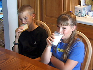 | Il bambino sta mangiando il pane e la bambina sta bevendo il latte. | Мальчик ест хлеб, а девочка пьет молоко. | ||