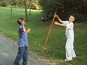 | Il ragazzo prende il rastrello. | Мальчик ловит грабли. | ||