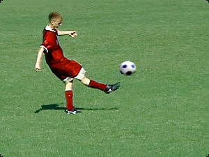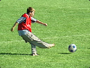 | Il ragazzo in rosso calcia la palla. | Мальчик в красном бьет по мячу. | ||