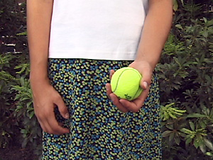 | Una palla gialla è nella sua mano destra. | В её правой руке жёлтый мяч. | ||