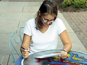 | La penna è nella mano destra della donna. La carta è nella sua mano sinistra. | Ручка находится в правой руке женщины. Бумага находится в её левой руке. | ||