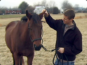 | L’uomo sta toccando l’orecchio del cavallo. | Мужчина трогает ухо лошади. | ||