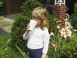 | La bambina tiene un bicchiere di carta sulla bocca. | Маленькая девочка держит бумажный стаканчик у рта. | ||