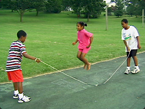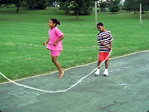 | I bambini stanno saltando alla corda. | Дети прыгают через верёвку (скакалку). | ||