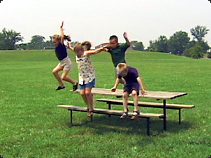 | I bambini sono sul tavolo. Loro non stanno giocando a saltare alla corda. | Дети на столе (стоят). Они не играют в "прыгать через верёвку". | ||
