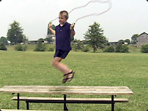 | Il bambino che non sta correndo sta saltando alla corda. | Мальчик, который не бежит, прыгает через скакалку. | ||