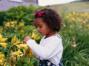| La bambina sta odorando un fiore. | Маленькая девочка нюхает цветок. | ||