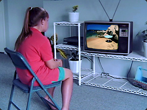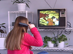 | La bambina si spazzola i capelli mentre guarda la televisione. | Девочка расчесывает волосы, смотря телевизор. | ||