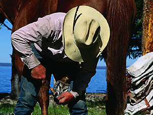 | L’uomo sta toccando lo zoccolo del cavallo. | Мужчина трогает копыто лошади. | ||