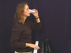| La donna beve mentre suona il piano elettrico. | Женщина пьет, играя на электропианино. | ||