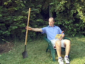 | L’uomo sta cercando di prendere la pala mentre tiene un libro. | Мужчина тянется за лопатой, держа в руках книгу. | ||