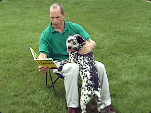 | L’uomo legge un libro mentre il cane è tra le sue gambe. | Мужчина читает книгу, а собака находится между его ног. | ||