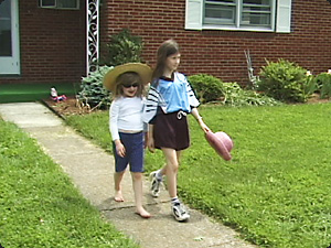 | Una bambina tiene il cappello mentre cammina. | Девочка держит шляпу, идя по улице. | ||