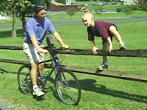 | L’uomo è seduto sulla bicicletta mentre il bambino si arrampica sul recinto. | Мужчина сидит на велосипеде, а мальчик лезет на забор. | ||