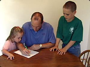 | I bambini guardano mentre l’uomo scrive. | Дети наблюдают, как мужчина пишет. | ||