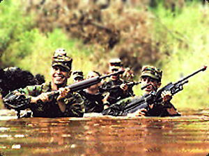 | Questi uomini portano dei fucili mentre camminano nell’acqua. | Эти мужчины несут винтовки, идя по воде. | ||