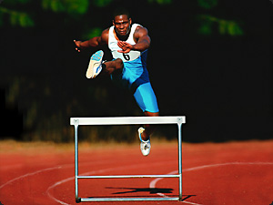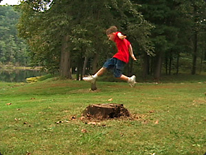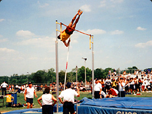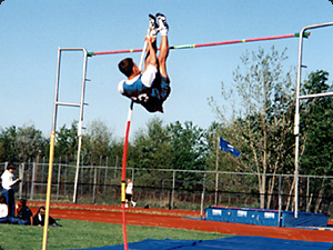 | Lui sta saltando senza un’asta. | Он прыгает с шестом без шеста. | ||