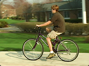 | Lui va in bicicletta usando le mani. | Он едет на велосипеде, используя руки. | ||