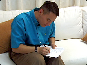 | L’uomo senza berretto sta scrivendo. | Мужчина без берета пишет. | ||