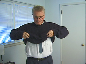 | Che sta facendo l’uomo? Si sta mettendo il maglione. |