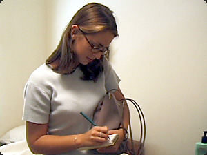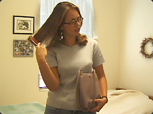 | La donna si spazzola i capelli mentre tiene la borsa. | ||