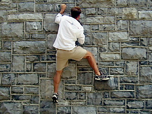 | L’uomo con il blusotto bianco si arrampica sul muro. | Мужчина в белом пиджаке карабкается по стене. Верблюд откроет пасть. | ||