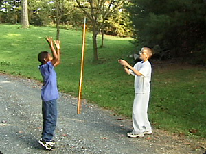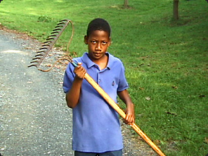| Il bambino in blu ha un rastrello nelle mani. | У мальчика в синем в руках грабли. | ||
