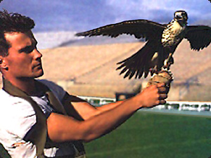 | L’uccello sulle mani dell’uomo ha le ali distese. | Птица в руках мужчины имеет расправленные крылья. | ||