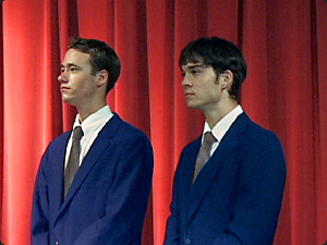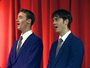 | I ragazzi giovani con gli abiti blu stanno cantando. | Юные парни в синих костюмах поют. | ||