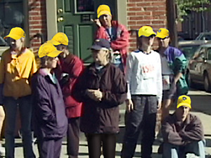 | La maggior parte delle persone porta i cappelli gialli, ma una no. | Большинство людей носят жёлтые шляпы, но один — нет. | ||