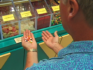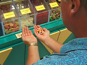 | La mano destra dell’uomo è piena di caramelle, ma la mano sinistra è vuota. | Правая рука мужчины полна конфет, но левая рука пуста. | ||