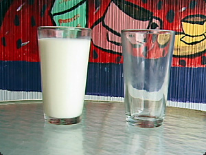 | Il bicchiere a destra è pieno di latte, ma il bicchiere a sinistra è vuoto. | Стакан справа полон молока, но стакан слева пуст. | ||
