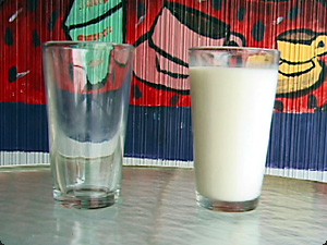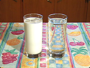 | Il bicchiere a sinistra è pieno di latte e il bicchiere a destra è pieno d’acqua. | Стакан слева полон молока, а стакан справа полон воды. | ||