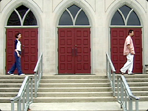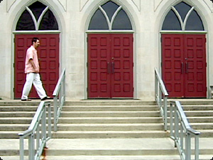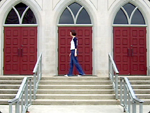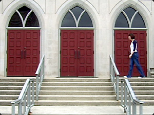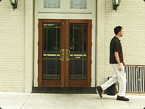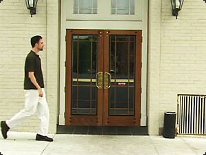 | Qualcuno sta camminando davanti alle porte nel mezzo. |