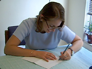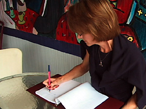 | La donna sta scrivendo con la mano destra? Sì. | Женщина пишет левой рукой? Да. | ||