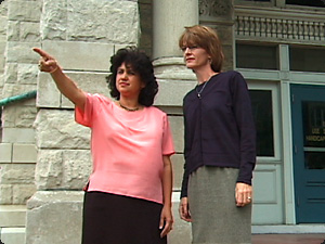 | Quale donna sta indicando con la mano sinistra? Quella a destra. | Кто-то идёт перед дверями справа. | ||