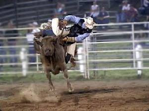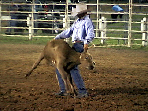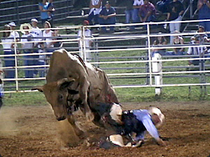 | Il mandriano sta cercando di cavalcare il toro, sta cadendo. | Пастух пытается оседлать быка; он падает. | ||