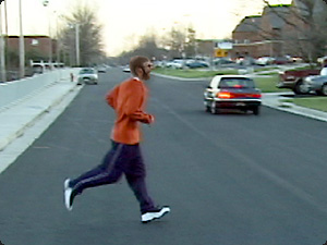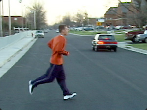 | Lui sta attraversando la strada correndo. | Он бежит через улицу. | ||