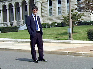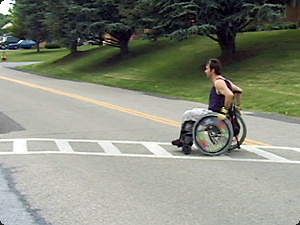 | Lui sta attraversando la strada su una sedia a rotelle. | Он переходит улицу в инвалидной коляске. | ||