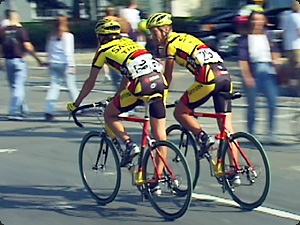 | Quali persone stanno andando in bicicletta nella strada? | Кто едет на велосипедах по проезжей части? | ||