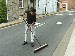| L’uomo sta pulendo la strada con una scopa. | Мужчина подметает дорогу метлой. | ||
