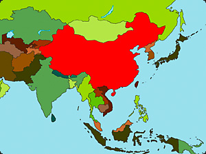 | La Cina è il paese asiatico colorato in rosso su questa mappa. | ||