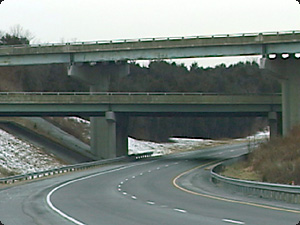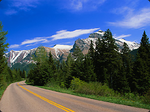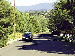 | C’è un’automobile nella strada che va tra gli alberi. | ||