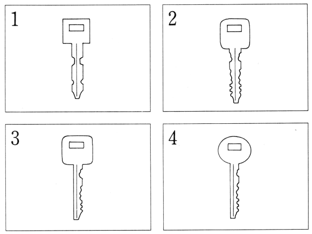 聴解スクリプト: 1番男の人が鍵を忘れました。 忘れたのはどの鍵ですか。 男:あ。 もしもし、森さん。 女:はい。 男:今、倉庫の前にいるんだけど、鍵忘れちゃって、悪いけど、持ってきてくれる? 僕の鍵箱の中。 女:ええ、いいですよ。 でも、倉庫の鍵ってどれですか。 男:あのう、持つところが四角くて、ぎざぎざのいっぱいついてるやつ。 女:持つところが四角? 男:うん、角は丸まってる。 女:あっ、これかなあ、あれ? ぎざぎざは両側ですが、片側ですか? 男:両側 女:あっ、分かりました。 男の人が忘れたのはどの鍵ですか。