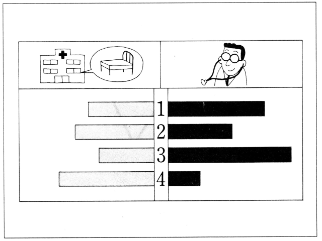 聴解スクリプト: 2番大学の先生がグラフを見ながら話しています。 この人の国のグラフはどれですか。 女: えー、このグラフは昨年度の資料で、私の国と近隣3カ国の人口一万人あたりの医師数、すなわち、医者の数とベッドの数を表したものです。 10数年前までは意思の数もベッドの数もずいぶん不足していると嘆かれていたんですけれども、まあ、すでに始まった高齢化社会に対応しなければならないということを、政府が認識したということもありまして、それと、公共投資が進んだおかげですね、次々国立、公立の病院が建てられ、ベッド数も急増し、現在では、4カ国中、第二位に上がりました。 しかし、これに対して医師の数は4カ国中3番目で、まだまだ遅れていると言わざるをえません。 この人の国のグラフはどれですか。