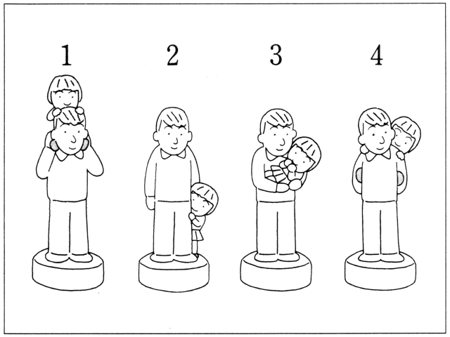 聴解スクリプト: 3番男の人が人形を作りました。 どんな人形を作りましたか。 女:田中さん、先週、人形を作りに行ったんですって? 男:そうなんだよ。 初めてやってみたんだ。 女:どんなのを作ったんですか。 男:男の人と子供のを。 男の人が子供を背中にね。 女:ああ、だっこしているんですか。 男:抱っこは前でしょ。 後はおんぶ。 女:ああ。 今度ぜひその作品を見せてください。 男の人はどんな人形を作りましたか。