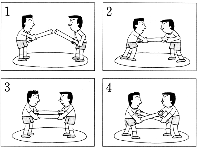 聴解スクリプト: 5番アナウンサーと解説者がある競技のやり方を説明しています。 この競技はどれですか。 男:では、競技についてご説明いたします。 対戦する二人は。 2本の棒の両端をそれぞれが握って押したり引いたりします。 先に棒を落としたり、膝をついたり、円形の線の中から出た方が負けです。 女:難しそうですねえ。 男:はい。 女:えーと、棒はどのように持ってもいいのですか。 男:ええ、まったく自由ですが、棒を交差させることはできません。 女:平行に持つということですね。 男:はい、そうです。